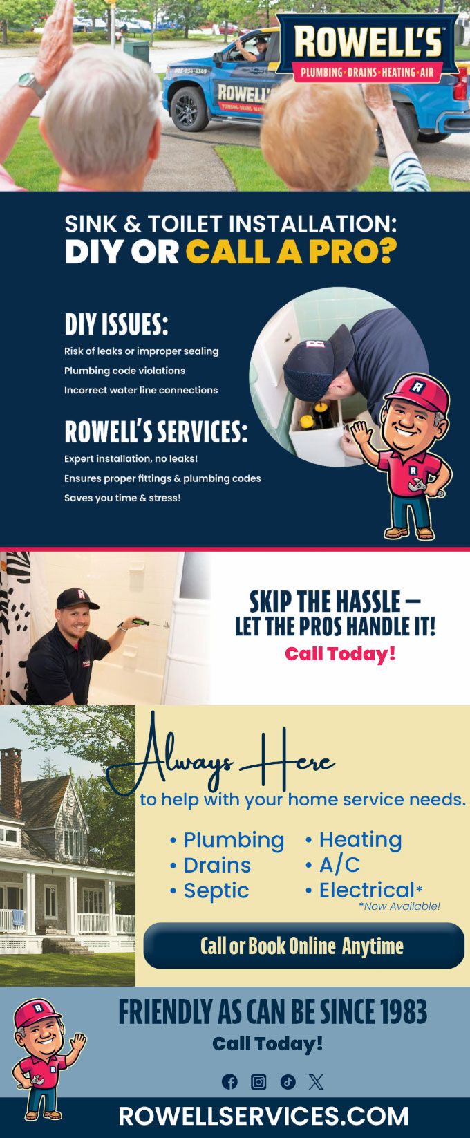 "Friendly As Can Be Since 1983!" When you need help with your plumbing, drains, heating, cooling or electrical in Derry, you can always rely on Rowell's Services! Call us now or book online!
