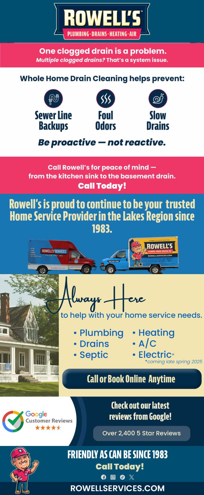 "Friendly As Can Be Since 1983!" When you need help with your plumbing, drains, heating, cooling or electrical in Derry, you can always rely on Rowell's Services! Call us now or book online!